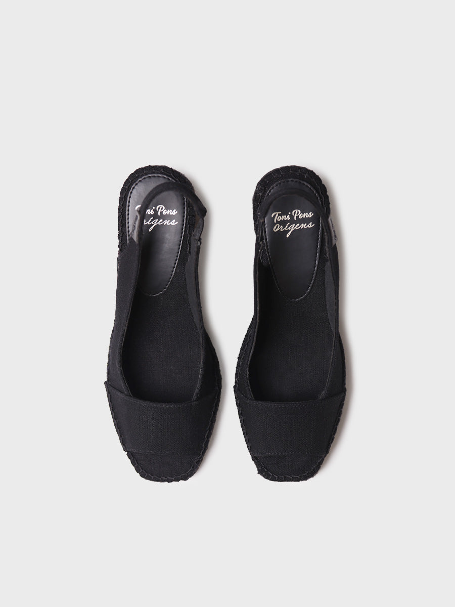 FIORE. This wedge espadrille is made of fabric with a jute wedge dyed to match. It is a model with an open toe and heel. The jute wedge has a total height of 7.5 cm, of which 5 cm belong to the heel and 1.5 cm to the sole. The insole is padded for greater comfort and the base of the sole is made of non-slip rubber. It features a back strap with an elastic to fit perfectly to the foot. It is a vegan model.